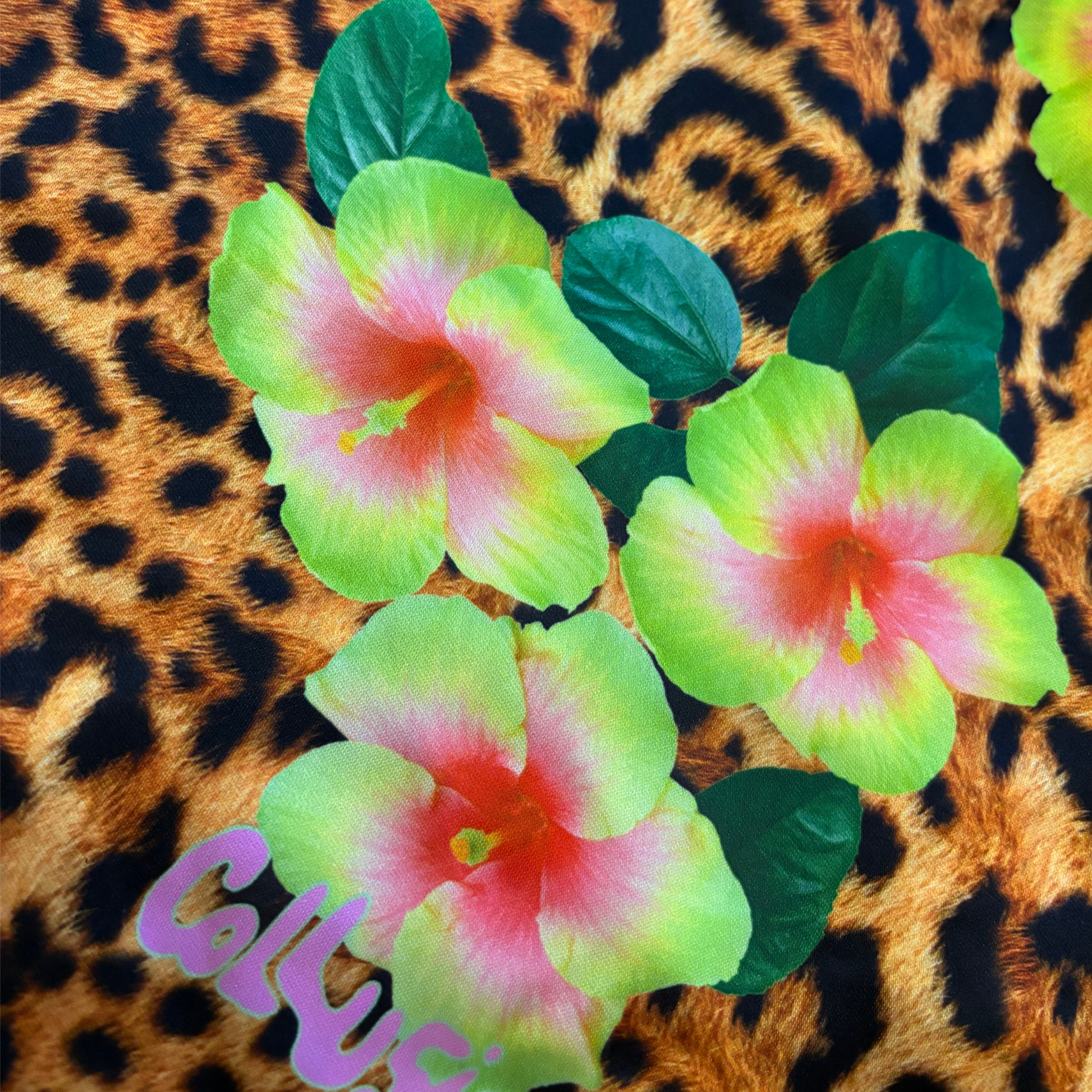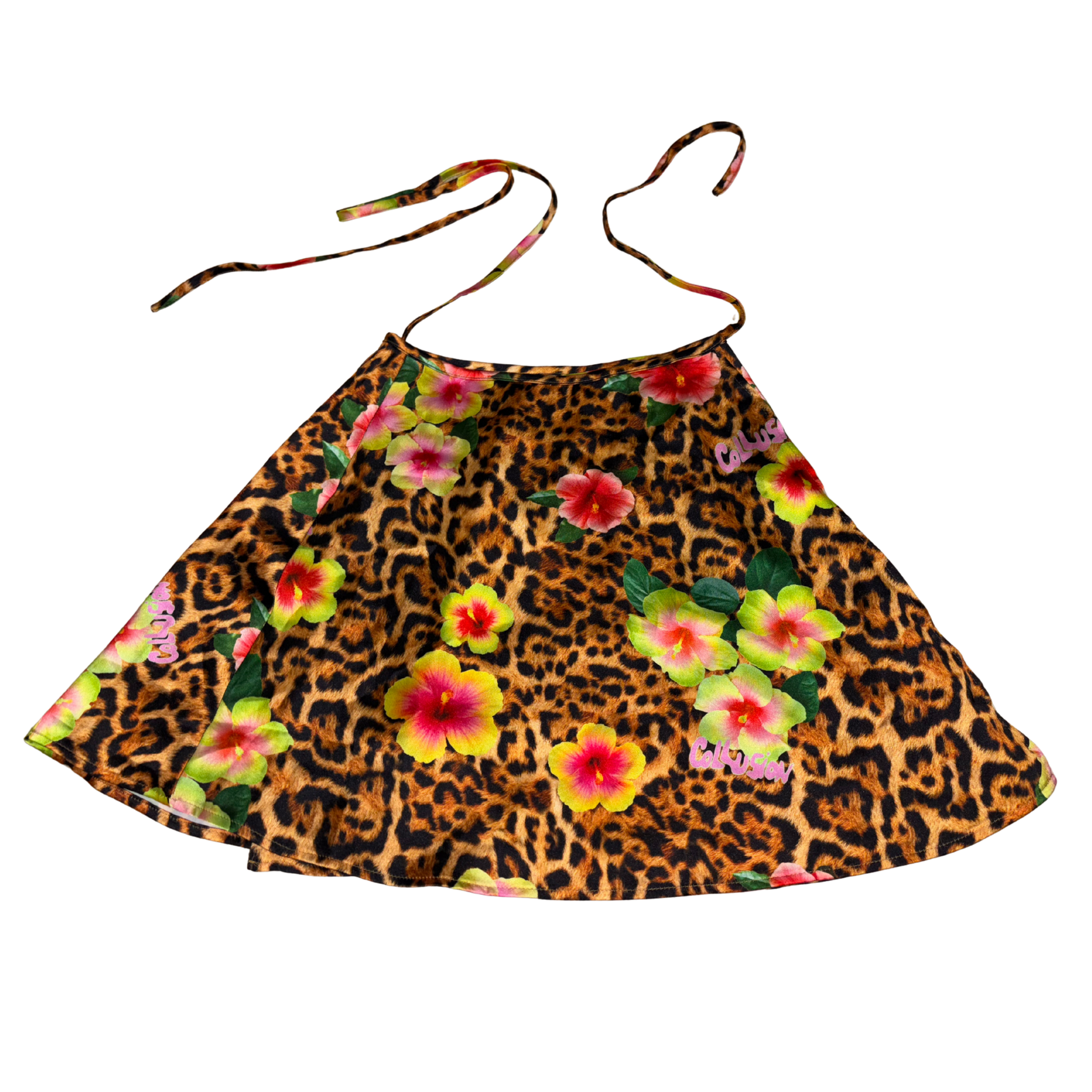 Turn heads in this fierce wrap mini skirt! With a bold leopard print and tropical hibiscus flowers, it’s the perfect mix of wild and tropical vibes. The flattering wrap design gives you a flattering fit while keeping things effortlessly cool.
