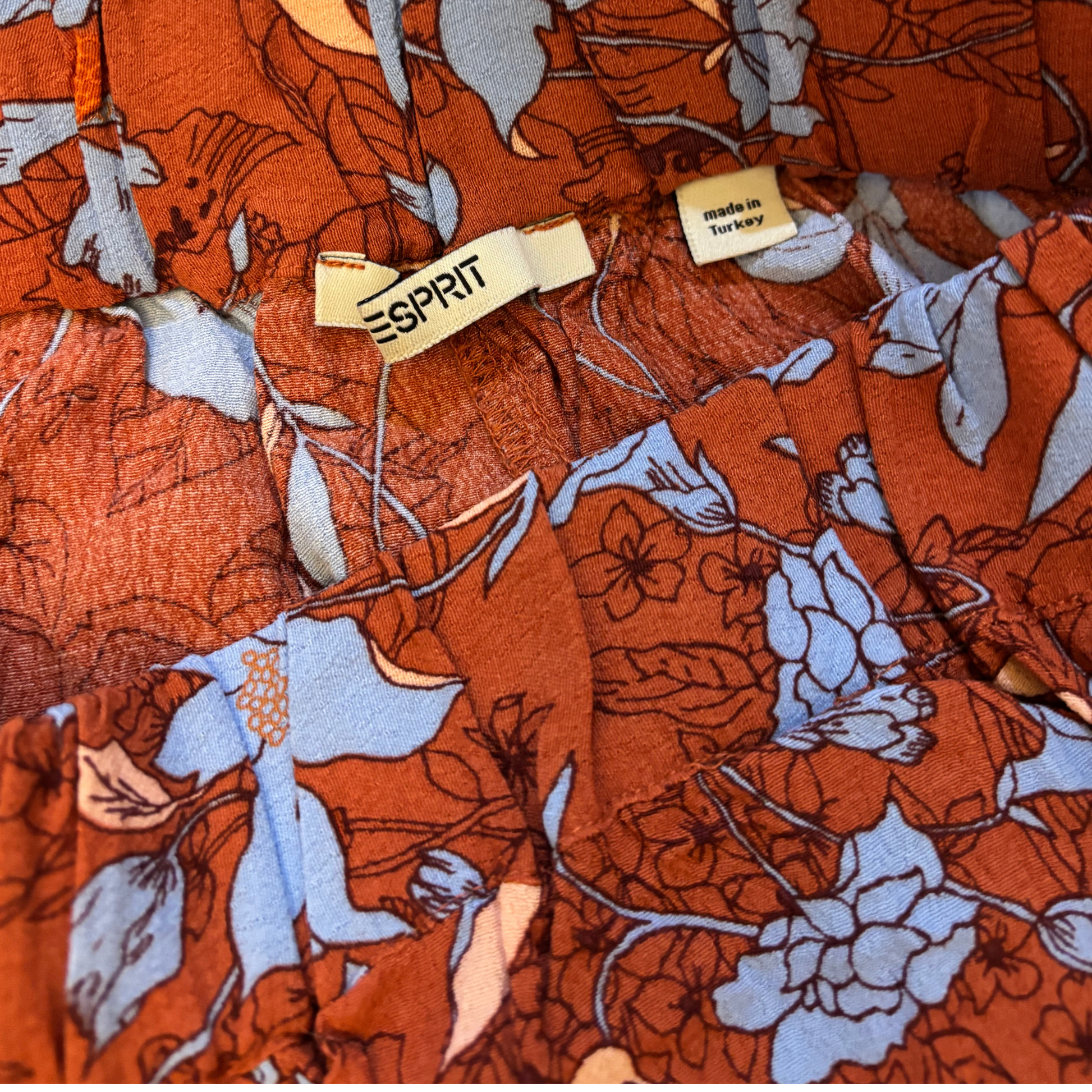 Say hello to your new floaty fave. The Esprit Floral Maxi Skirt brings all the autumnal charm with a rust-orange base and soft blue blooms that make it pop. Lightweight and flowy, it moves like a dream. Perfect for golden hour strolls or laid-back brunch dates.