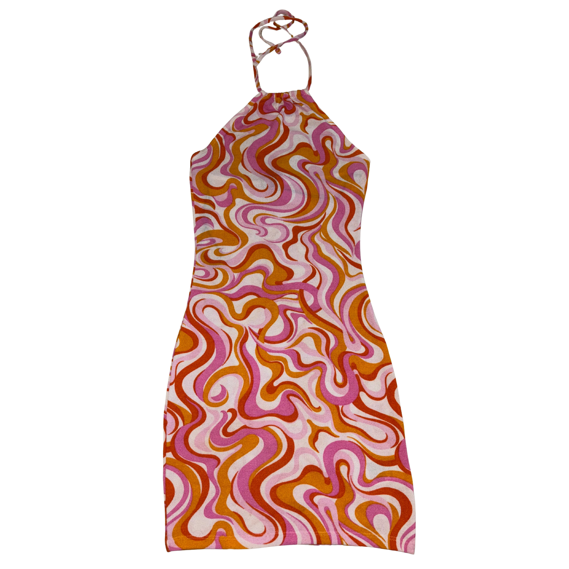 Bring retro vibes into your wardrobe with this pink and orange swirl-print mini dress. Designed with a self-tie halterneck and a body-hugging silhouette, it’s the ultimate feel-good piece for sunny days and fun nights.