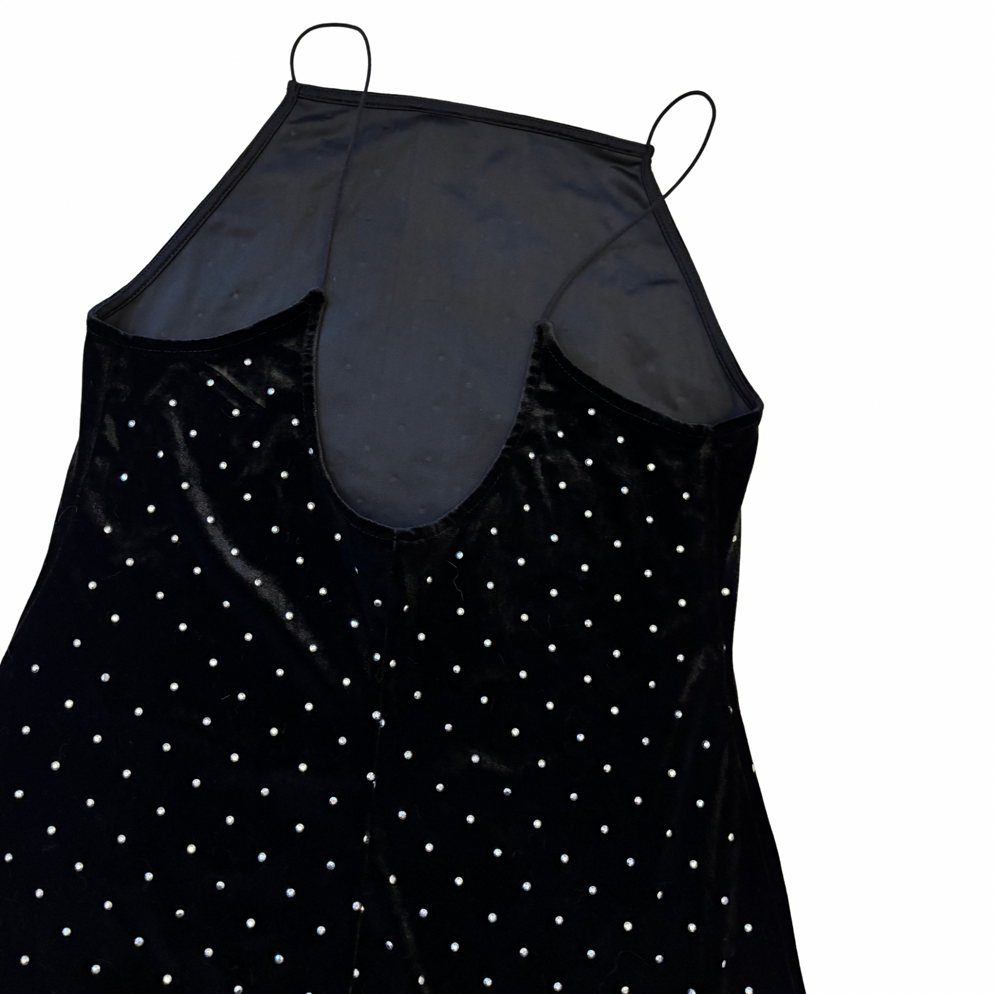 Turn up the sparkle and sophistication in this black velvet dress from H&M. Covered in glimmering diamantes that catch the light with every move, this dress is made for making a statement. The spaghetti straps and low back add a sultry, feminine touch, while the fitted silhouette hugs your curves for a sleek, flattering look.