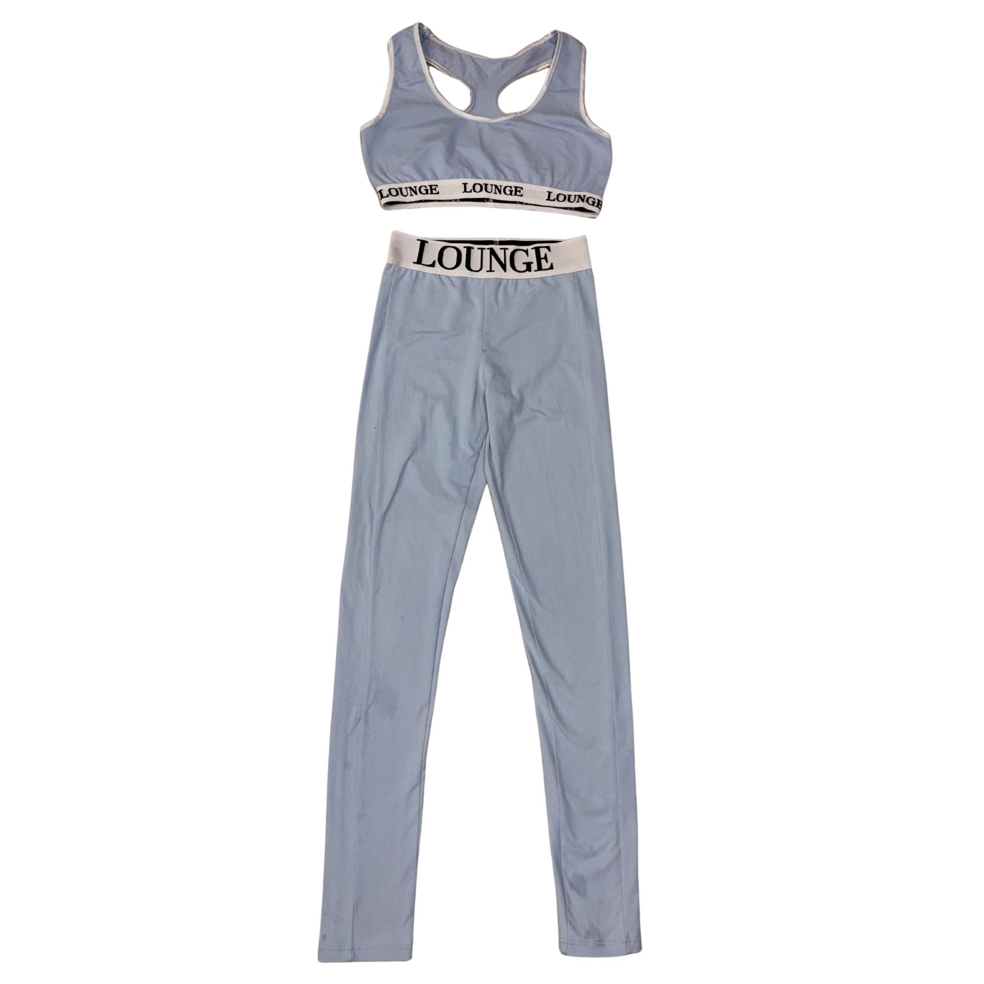 This blue Lounge set is all about comfy, coordinated vibes. The soft, stretchy leggings give a smooth, flattering fit, while the matching bralette keeps things supportive and effortless. Both pieces feature bold branding along the waistband and the bottom of the bralette for that sporty, put-together finish. Perfect for lazy days, quick errands, or just feeling cute while staying comfy.