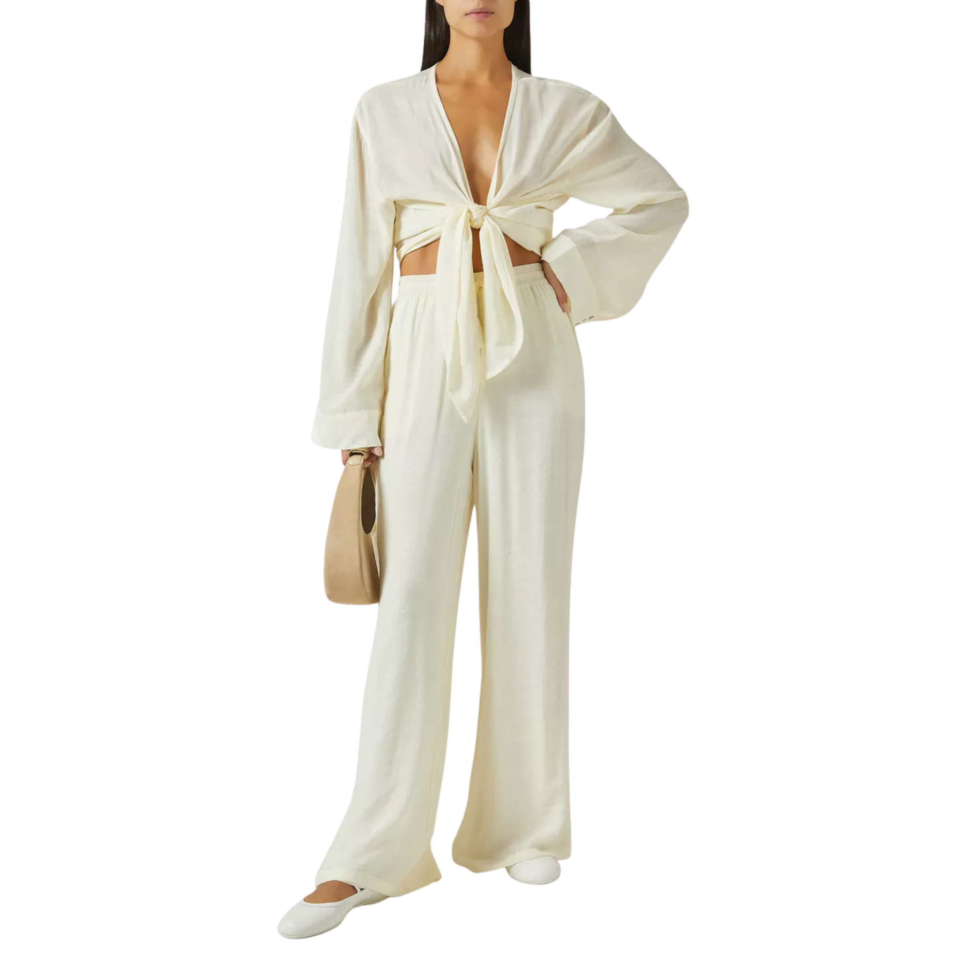 Elevate your beachside game with this ultra-chic co-ord from Monday Swimwear. The perfect bikini cover-up, this long sleeve shirt and matching long pants are crafted from a light, linen-like material in a creamy hue that’s as dreamy as a sun-kissed morning. Effortlessly breezy and cool, it’s your go-to for lounging poolside or strolling along the shore in style.