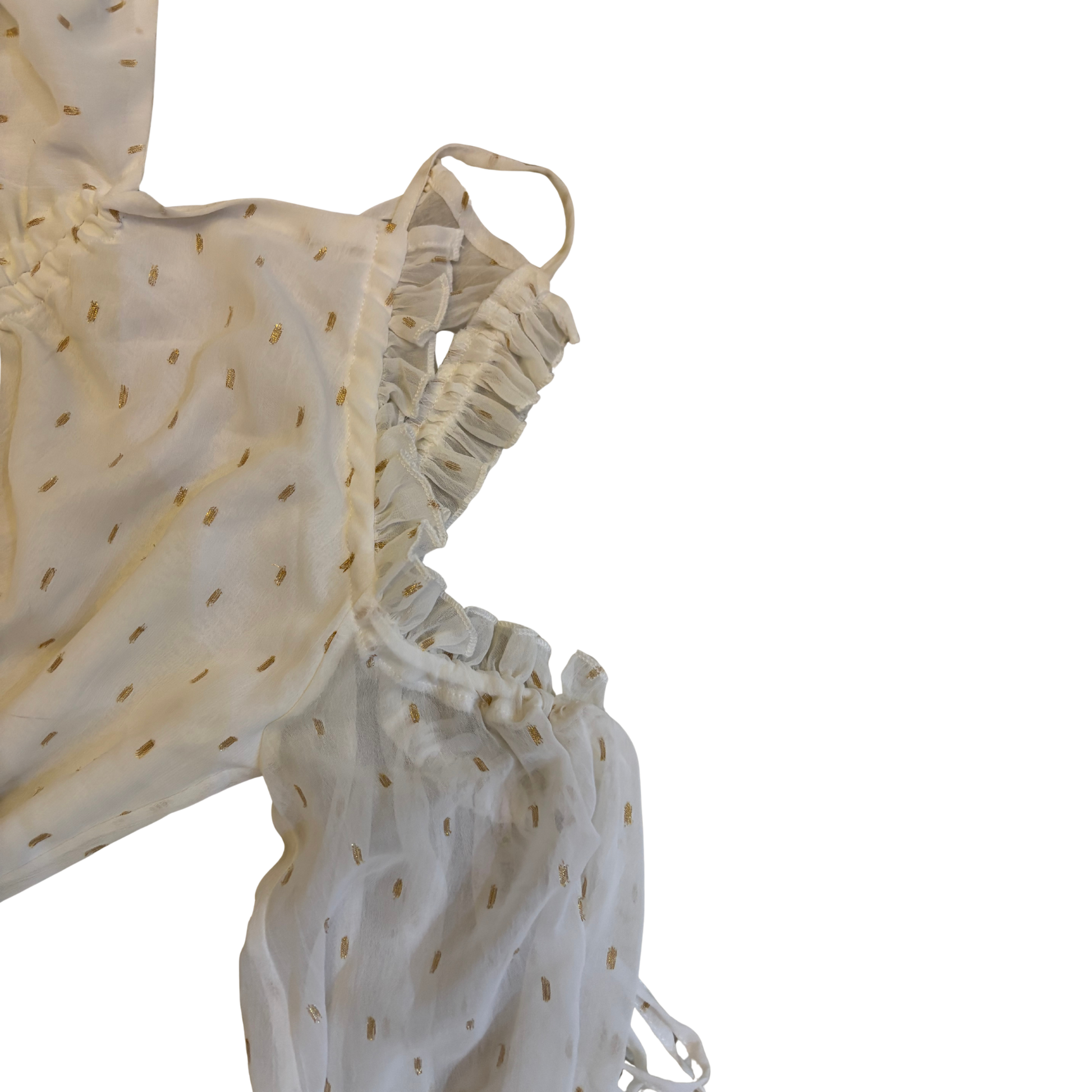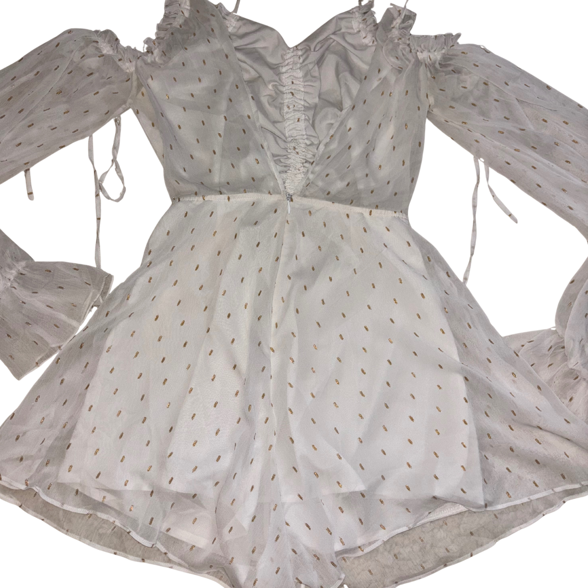 Channel effortless elegance in our White Mesh Playsuit, where bold meets chic! Featuring a stunning ruched front for that figure-flattering fit and cut-out shoulders that bring a touch of sass, this playsuit is pure glam. The gold detailing adds just the right amount of sparkle, while the long sleeves and zip-up open back keep it edgy yet sophisticated. Whether you’re hitting up a rooftop party or strutting into a night out, this playsuit has you covered in style.