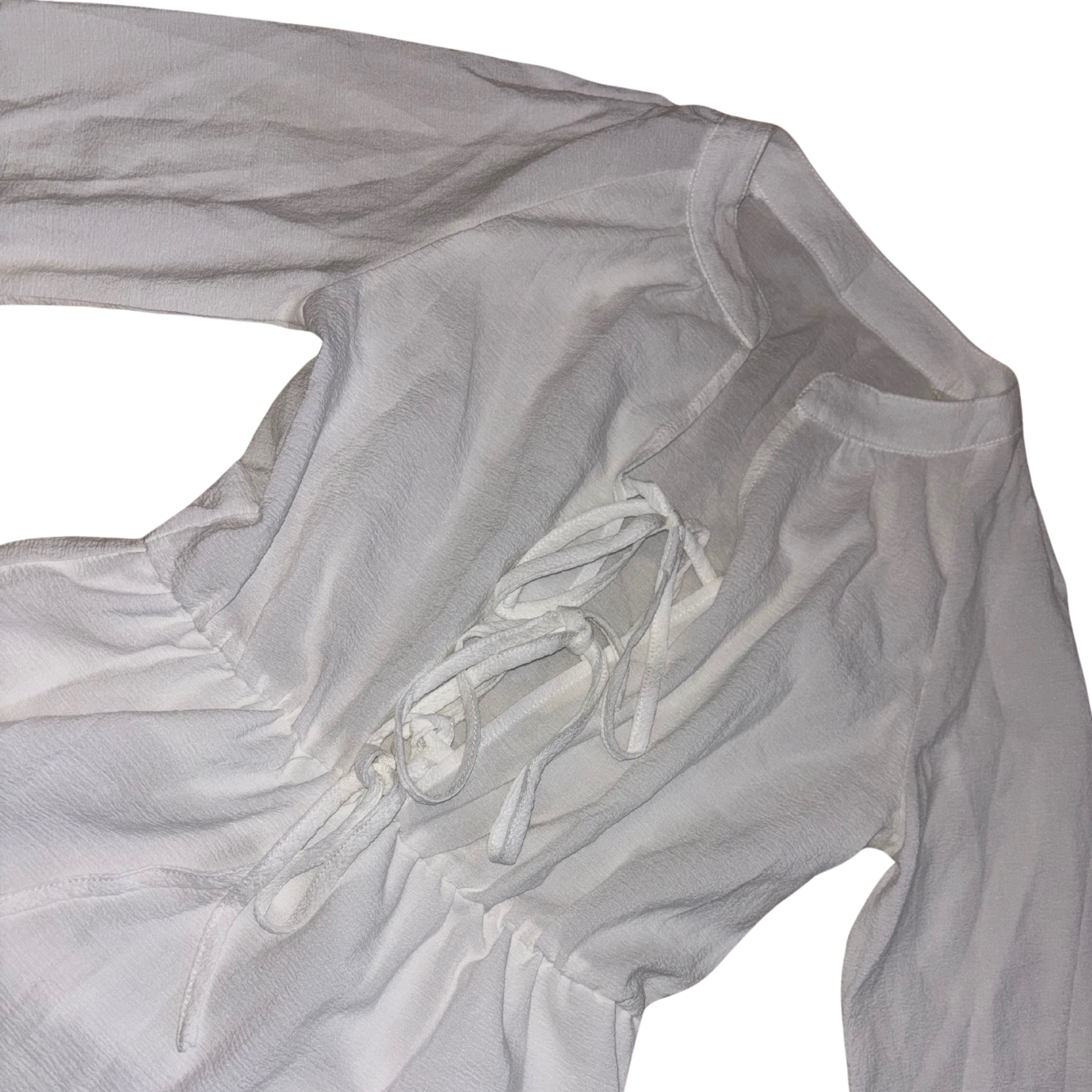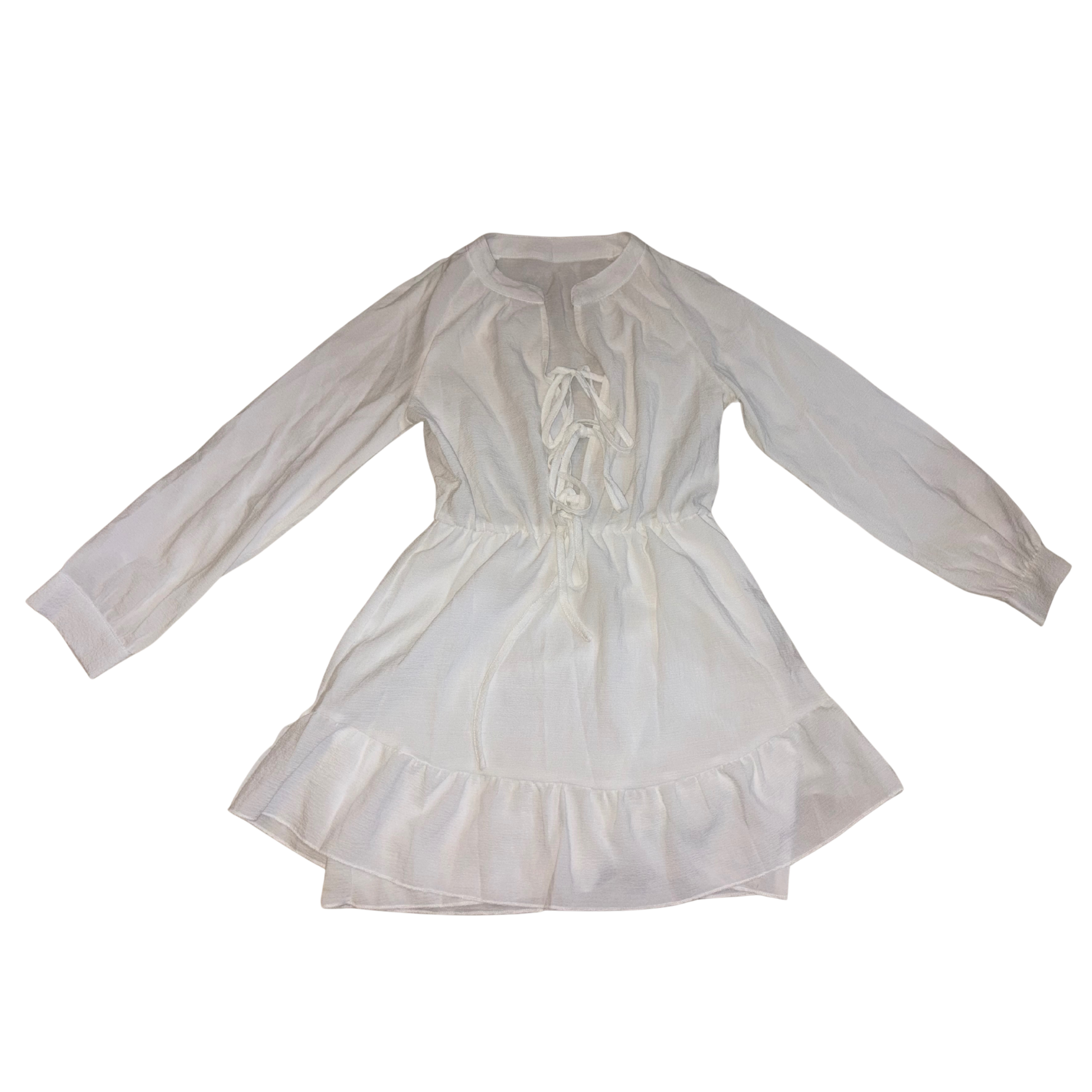 Embrace effortless elegance with this gorgeous white mini dress! Featuring a stunning open front design with delicate tie details, this dress combines playful charm with a touch of sophistication. The floaty skirt adds a dreamy, carefree vibe, perfect for twirling through sunny days or breezy evenings. With long sleeves for a touch of coverage and those flattering ties to adjust the fit, this dress is a must-have for adding a bit of whimsy to any occasion.