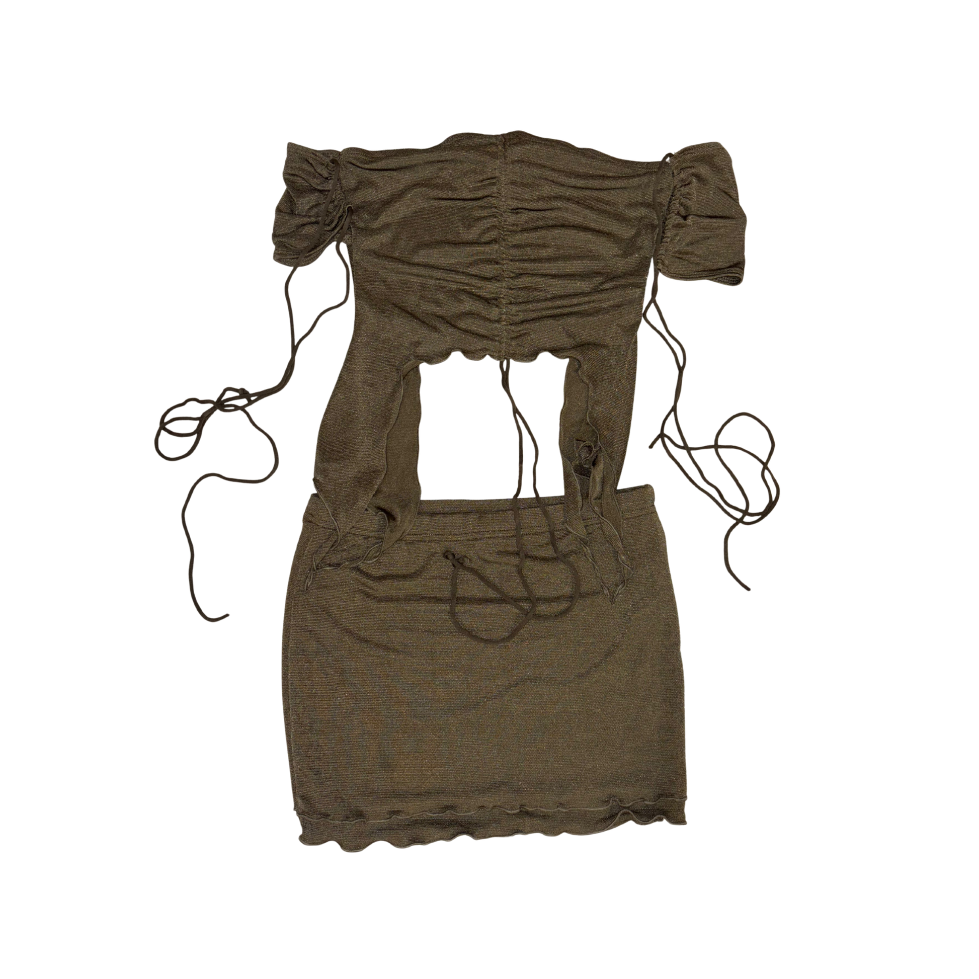 Effortlessly chic and totally coordinated, this dark green bandeau set is made for turning heads. The cropped top features a flattering bandeau neckline with adjustable drawstring detailing, while the matching mini skirt sits perfectly for a sleek, streamlined look. The deep green hue adds a touch of sophistication, making it easy to dress up with heels or keep casual with sneakers. Perfect for brunch dates, nights out, or any occasion where you want a polished, put-together vibe with minimal effort.