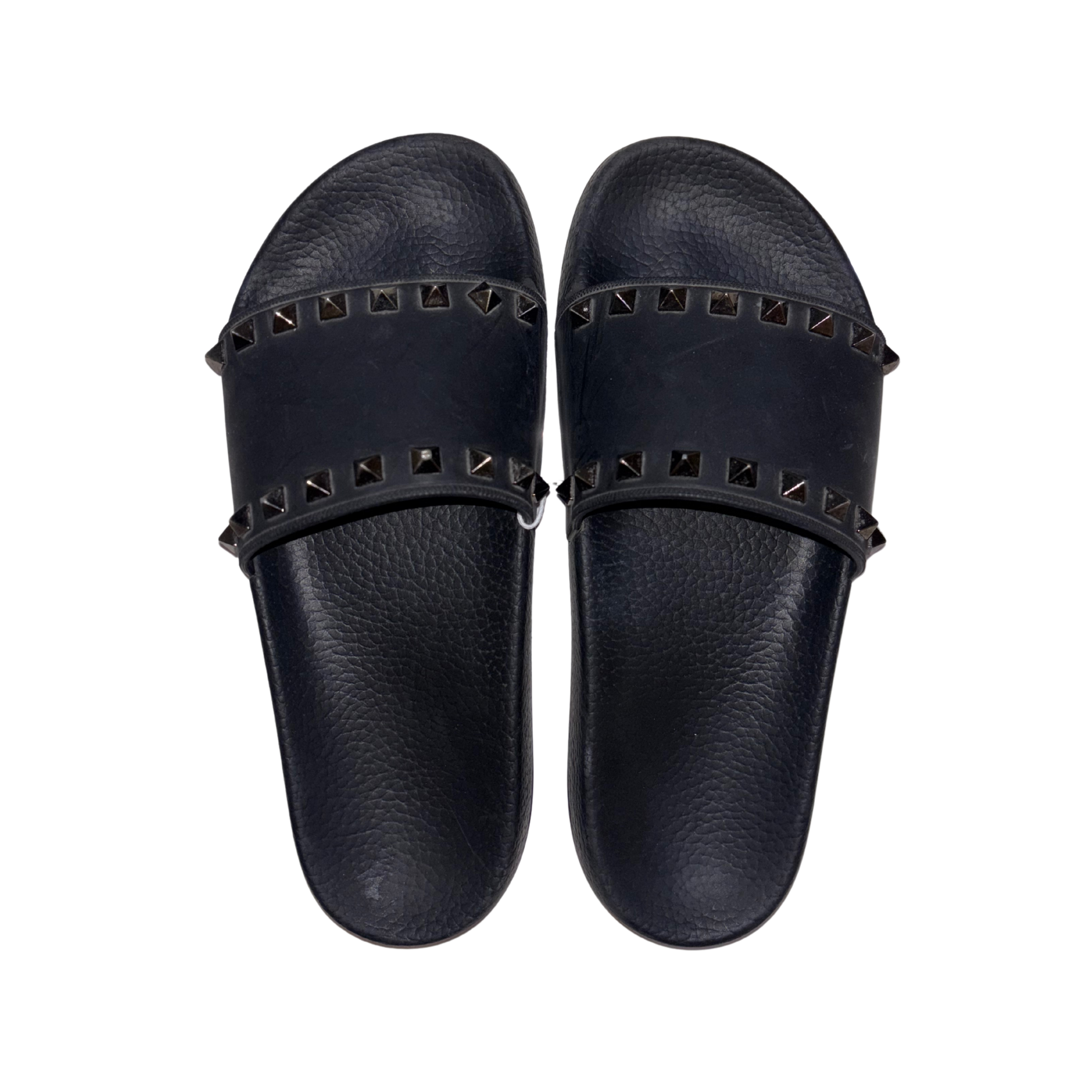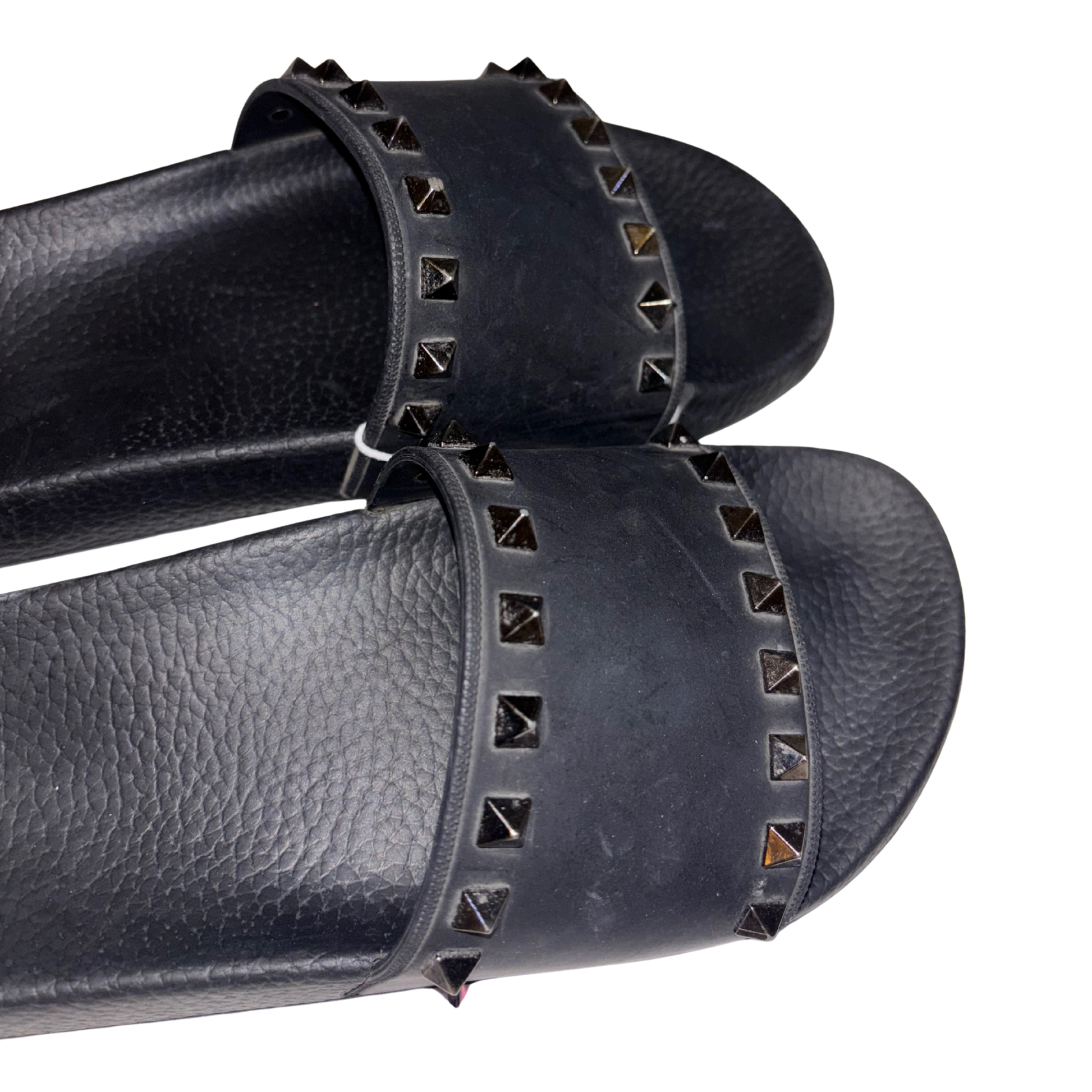 Slip into luxury with attitude. The Valentino Rockstud Sliders are your new go-to for effortless glam. Featuring a sleek black base and the brand’s iconic gold pyramid studs, these slides strike the perfect balance between edgy and elegant.