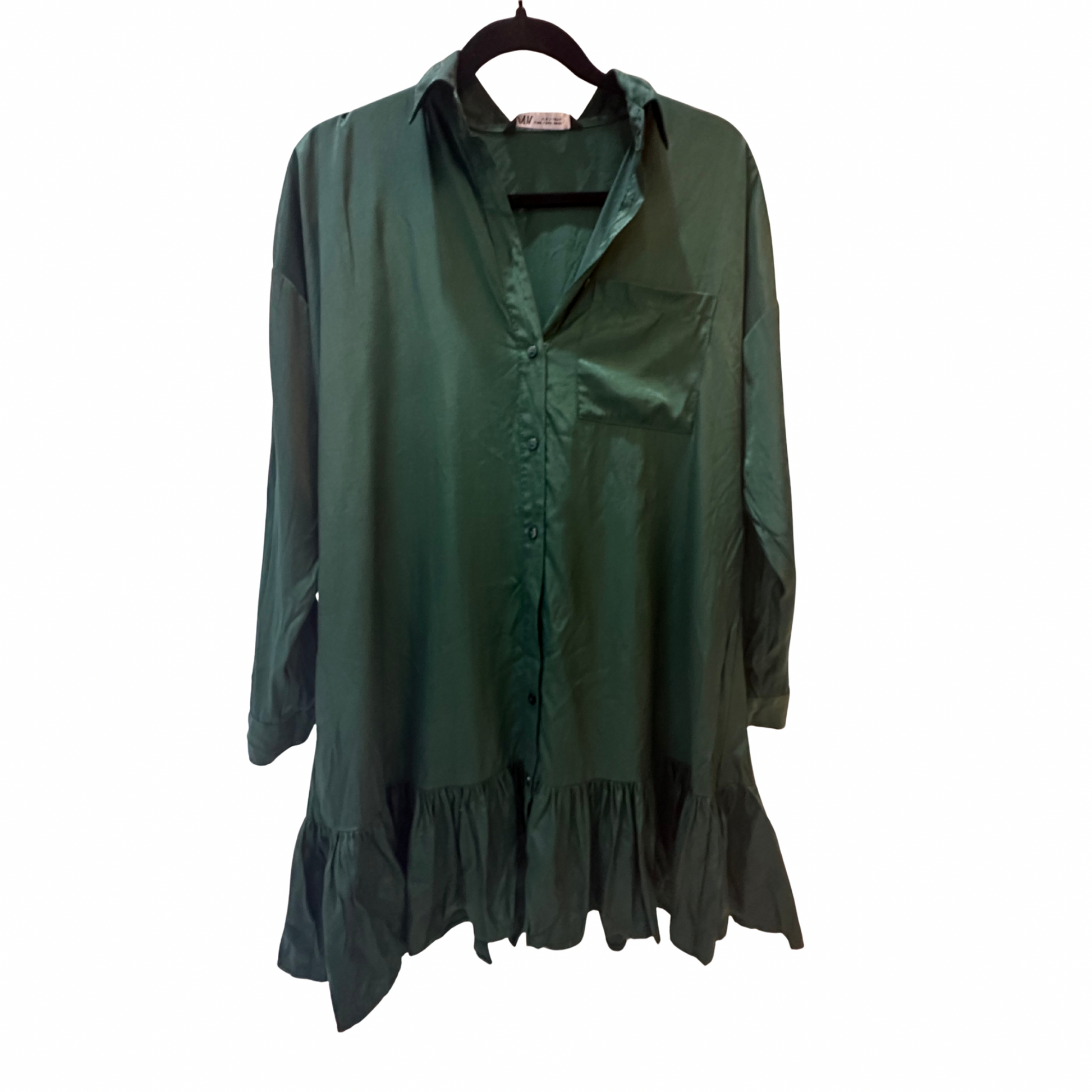Effortlessly chic, this dark green satin dress from Zara features a classic shirt collar and button-up front. The pleated hem adds a touch of movement and elegance, making it perfect for work, brunch, or evening events.