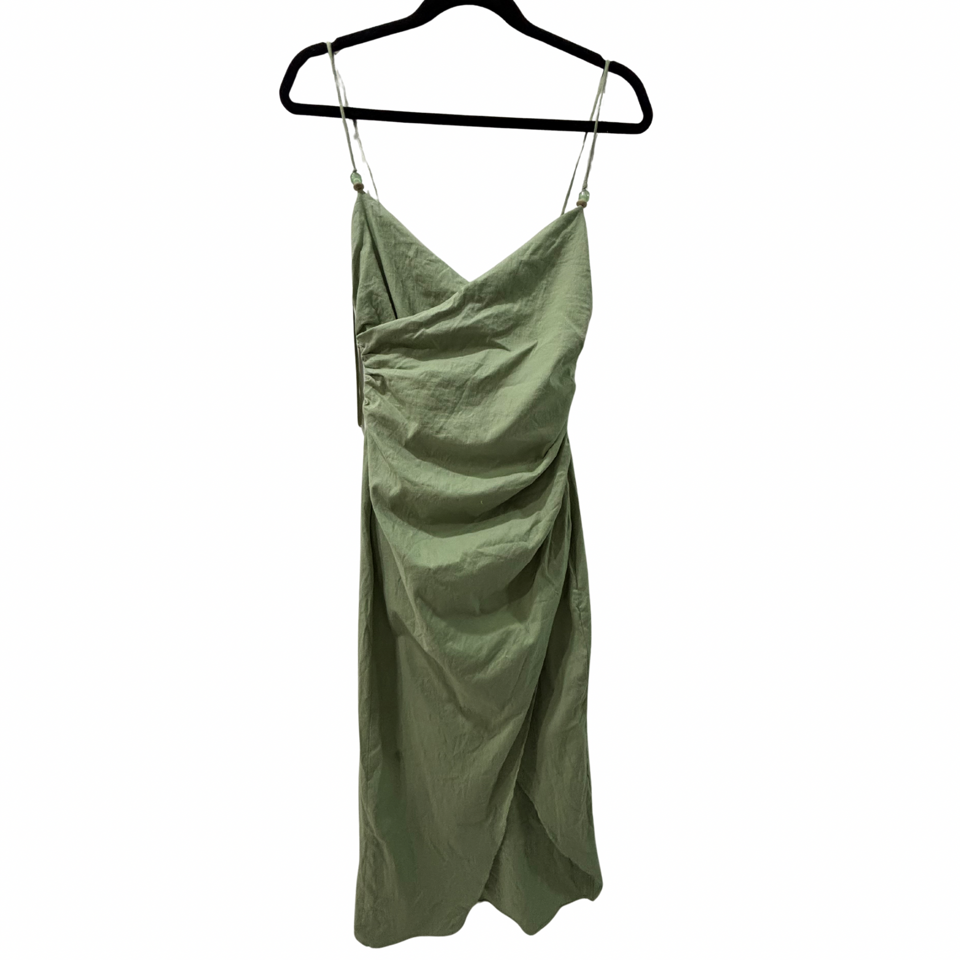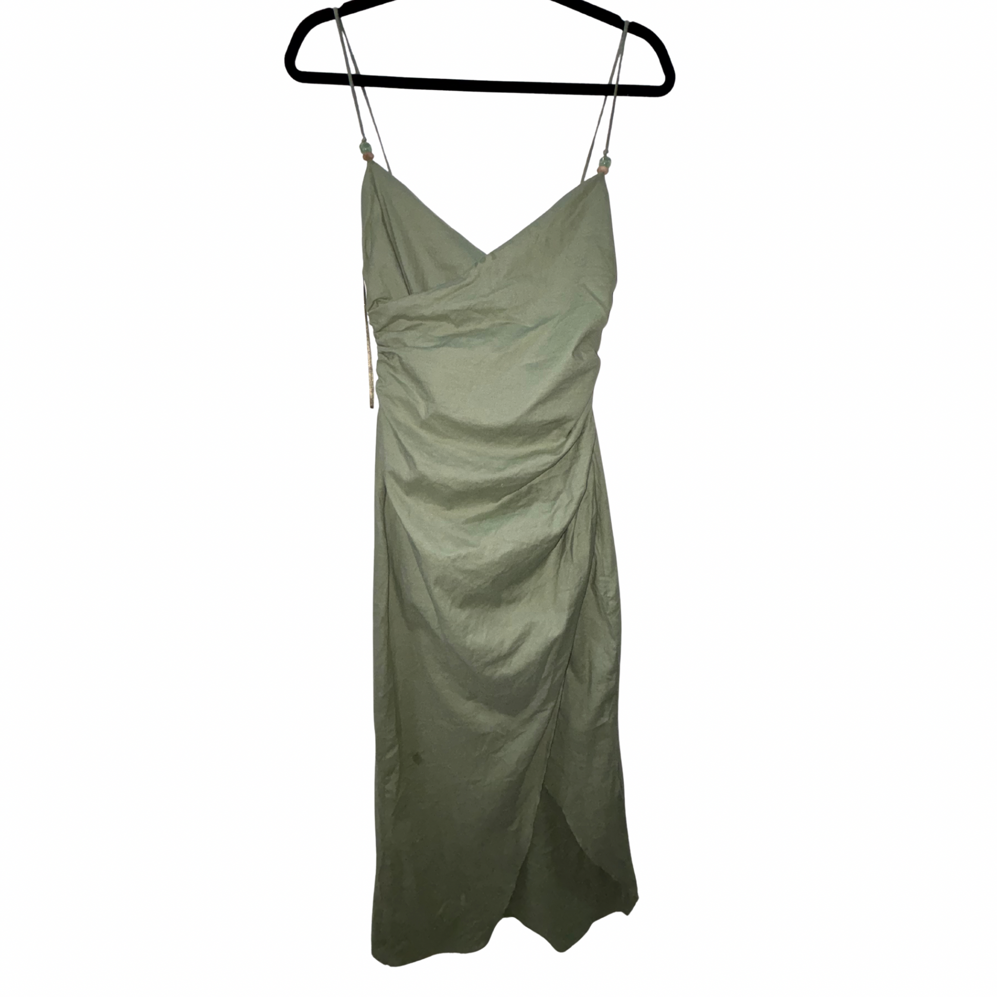 Elegant and breezy, this pale green linen-blend midi dress from Zara features thin beaded straps, a crossover V-neck, and side ruching that creates a subtle slit. Perfect for sunny days, brunches, or effortless summer style.