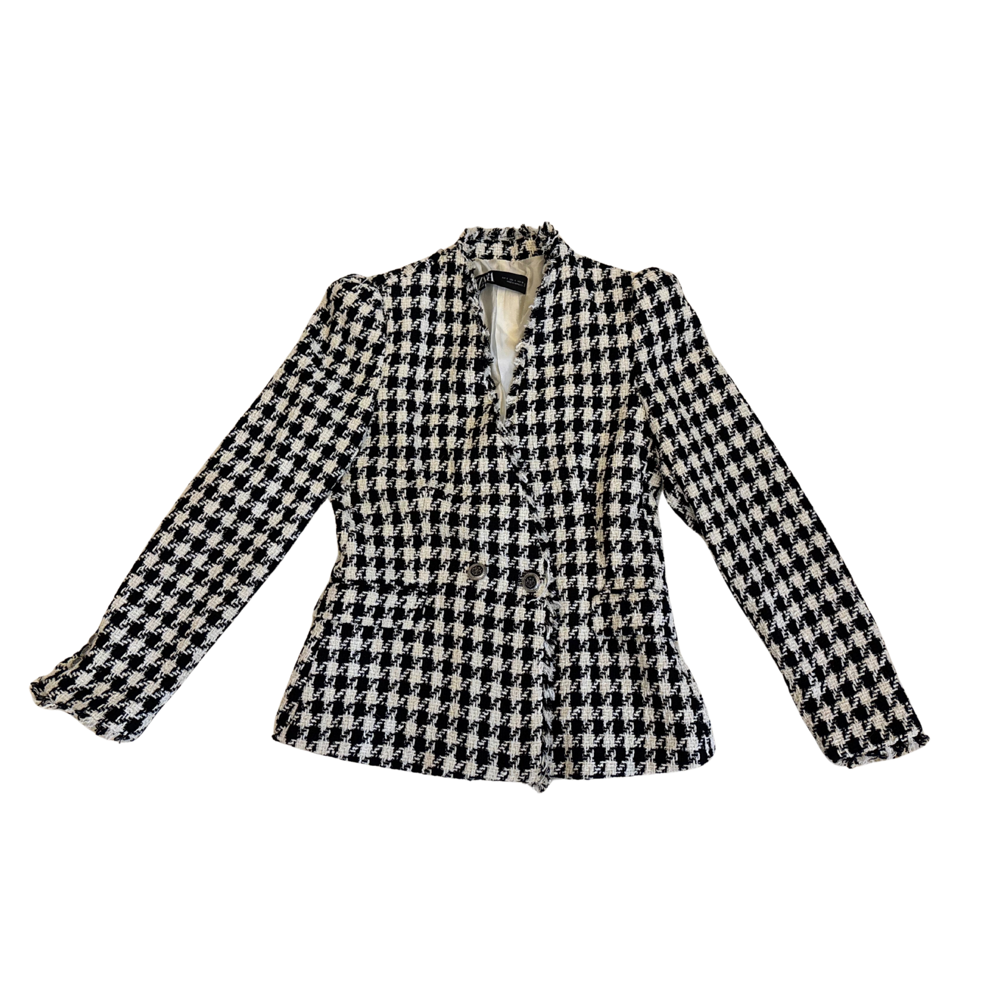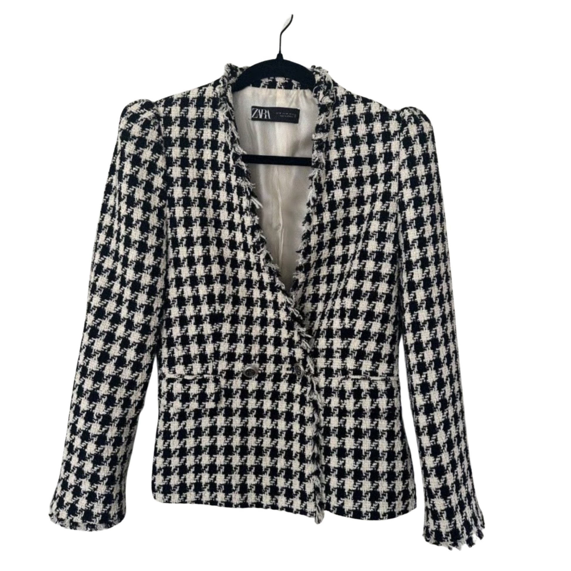 Make a statement with this Zara houndstooth blazer, where classic style meets modern flair. The black and white houndstooth print adds an iconic touch, while the fringe detailing on the hems brings a playful twist to this tailored piece. Featuring a double-button fastening and functional pockets, this blazer combines sophistication with standout style.