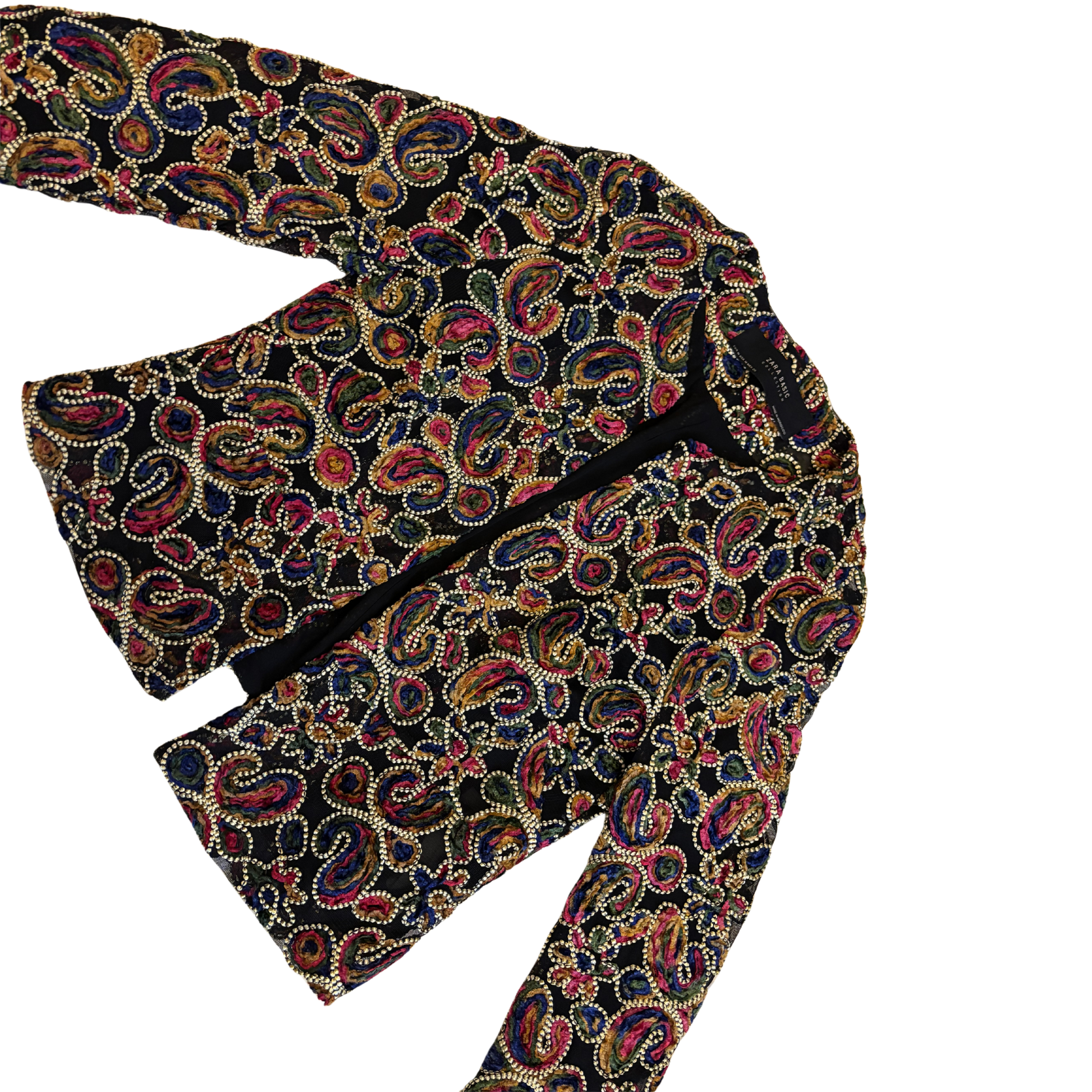 Stand out in this rare Zara blazer, featuring vibrant multicoloured embroidery and delicate beading in an abstract design. A true statement piece, it adds a pop of personality and luxury to any outfit. Perfect for layering over a simple base, this blazer turns everyday style into something extraordinary!